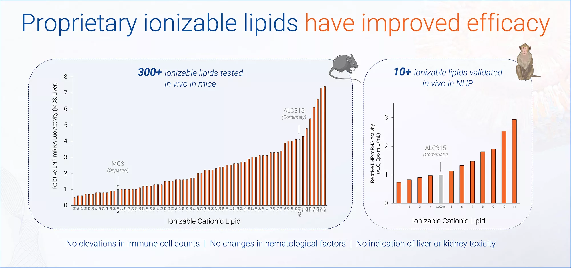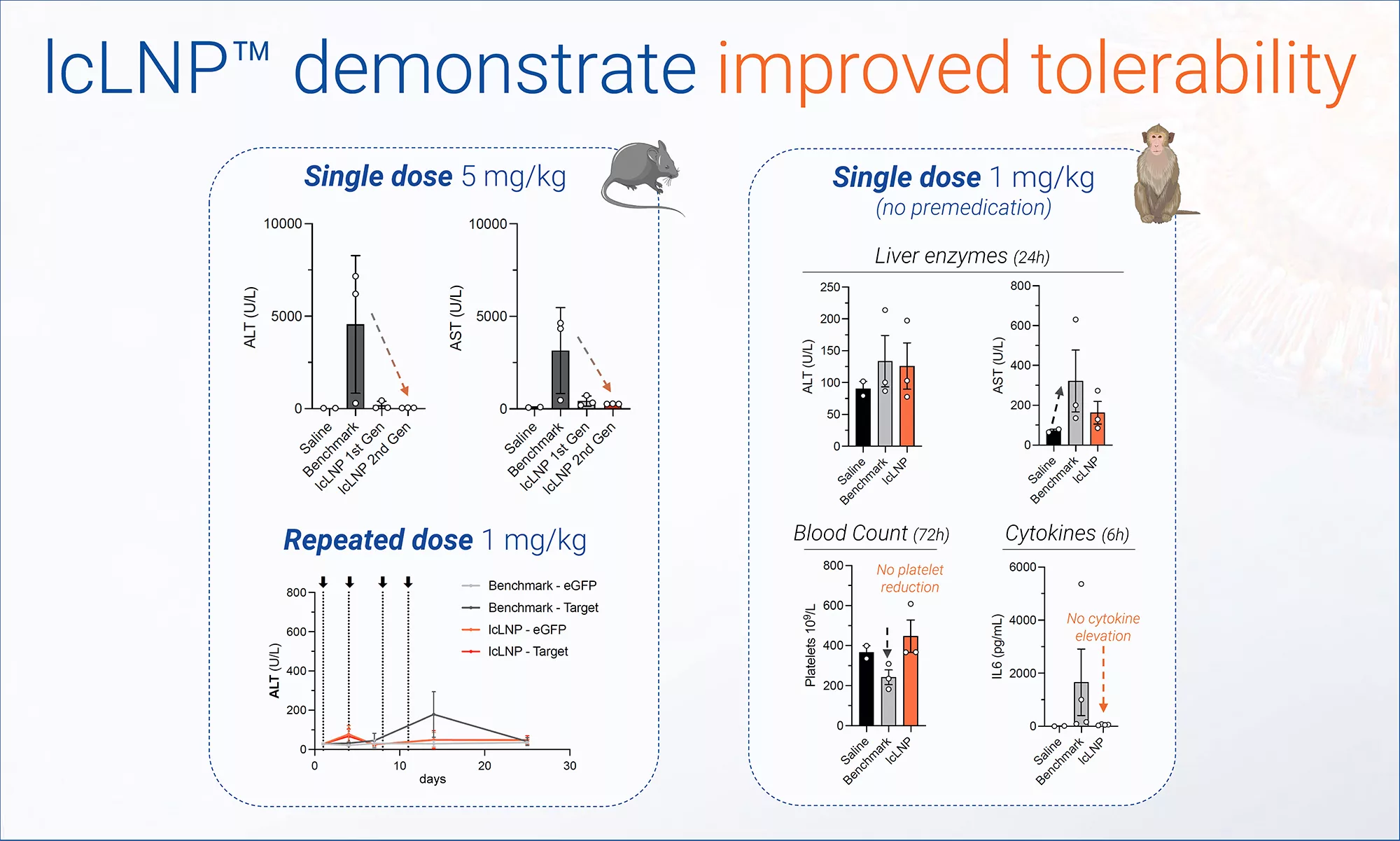 This extended exposure underpins functional delivery to immune compartments and bone marrow, including enhanced mRNA delivery to T cells – extrahepatic targets that partners have struggled to reach without targeting ligands.