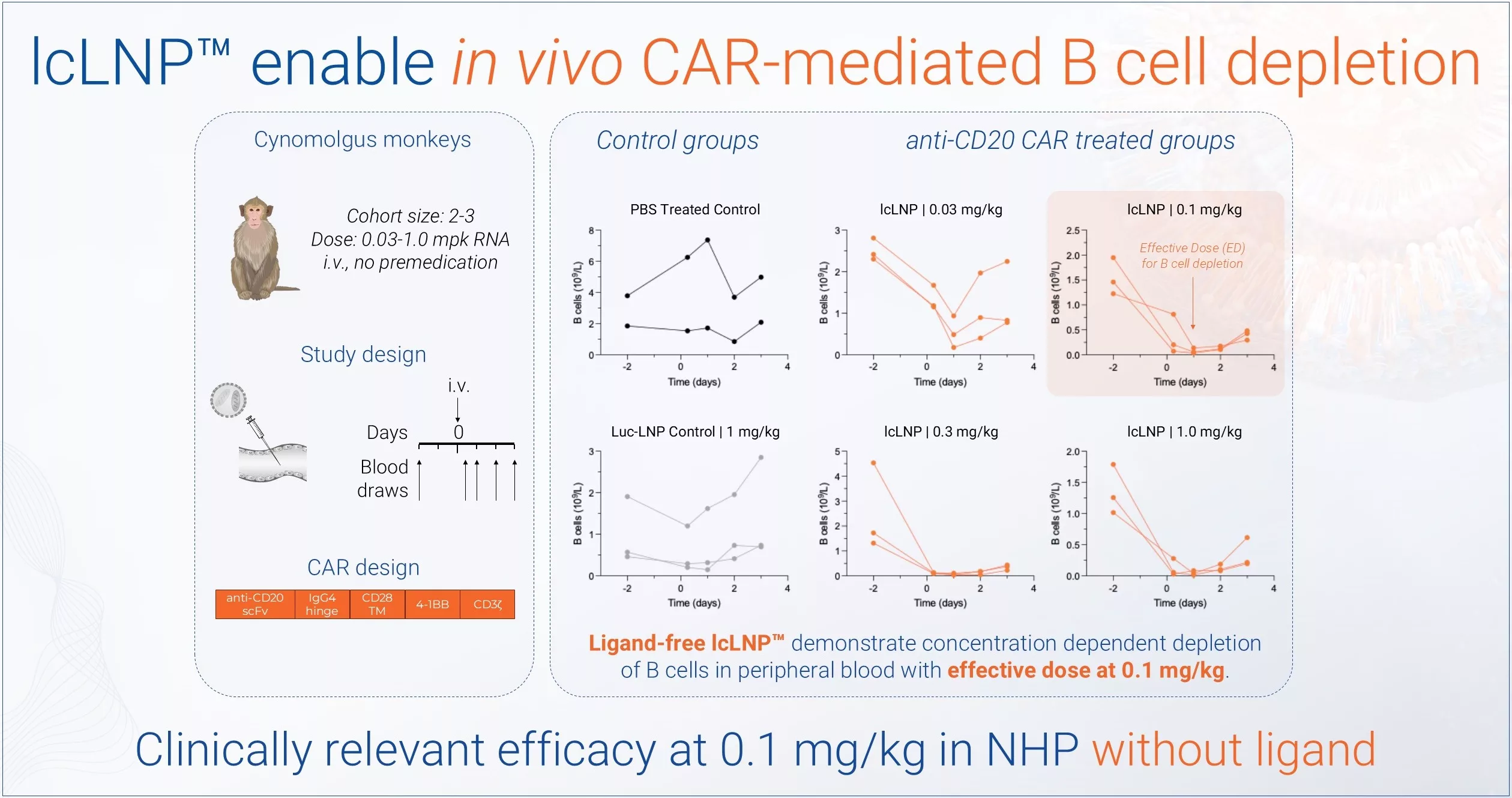 further highlight NanoVation’s ligand-free, lcLNP™ technology for functional delivery to extrahepatic tissues. Demonstrating in vivo CAR for B cell depletion at clinically relevant doses.